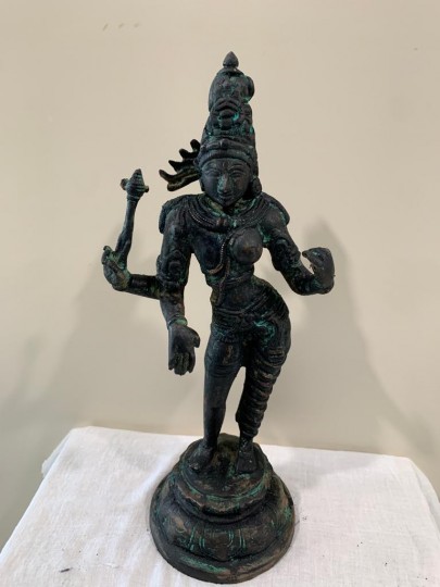 The brass statue of Gautam Buddha preaching his dhamma sits in padmasana on a jet black lotus plinth decorated in an amazingly blended pattern.