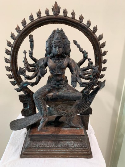 The brass statue of Gautam Buddha preaching his dhamma sits in padmasana on a jet black lotus plinth decorated in an amazingly blended pattern.
