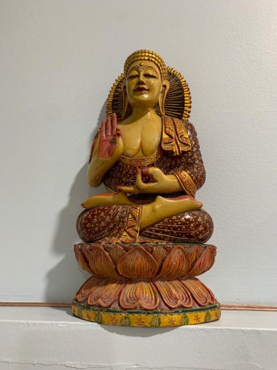 The brass statue of Gautam Buddha preaching his dhamma sits in padmasana on a jet black lotus plinth decorated in an amazingly blended pattern.