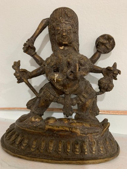 The brass statue of Gautam Buddha preaching his dhamma sits in padmasana on a jet black lotus plinth decorated in an amazingly blended pattern.