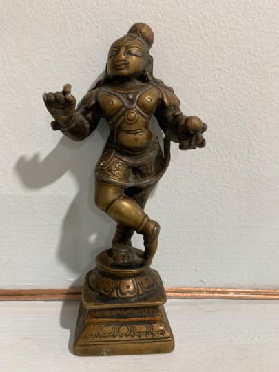 The brass statue of Gautam Buddha preaching his dhamma sits in padmasana on a jet black lotus plinth decorated in an amazingly blended pattern.